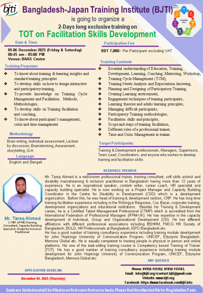 BANGLADESH-JAPAN TRAINING INSTITUTE (BJTI) is going to organize a 2-Days Long Exclusive Training on