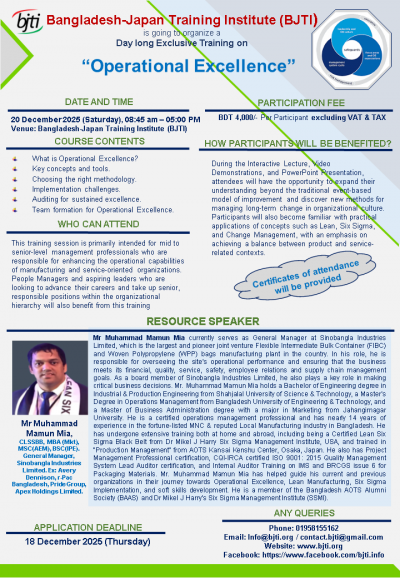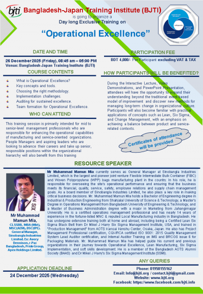 INSTITUTE (BJTI) is going to organize a Day Long Exclusive Training on "Operational Excellence"