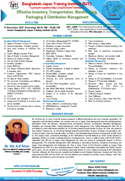 BANGLADESH-JAPAN TRAINING INSTITUTE (BJTI) is going to organize a Day Long