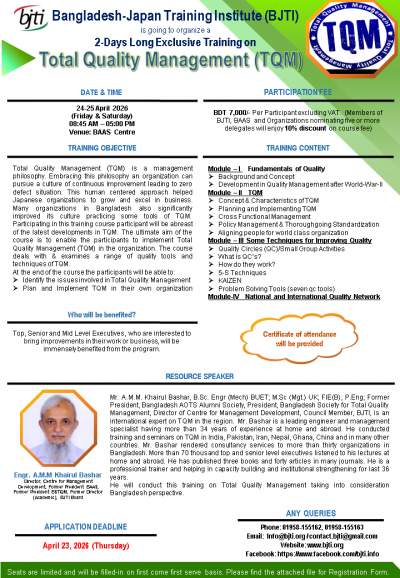 BANGLADESH-JAPAN TRAINING INSTITUTE (BJTI) is going to organize a 2-Days Long Exclusive Training on